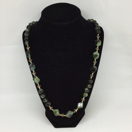Marbled faux Jade acrylic round and elongated square beads with Gold tone spacers make up this delightful necklace.